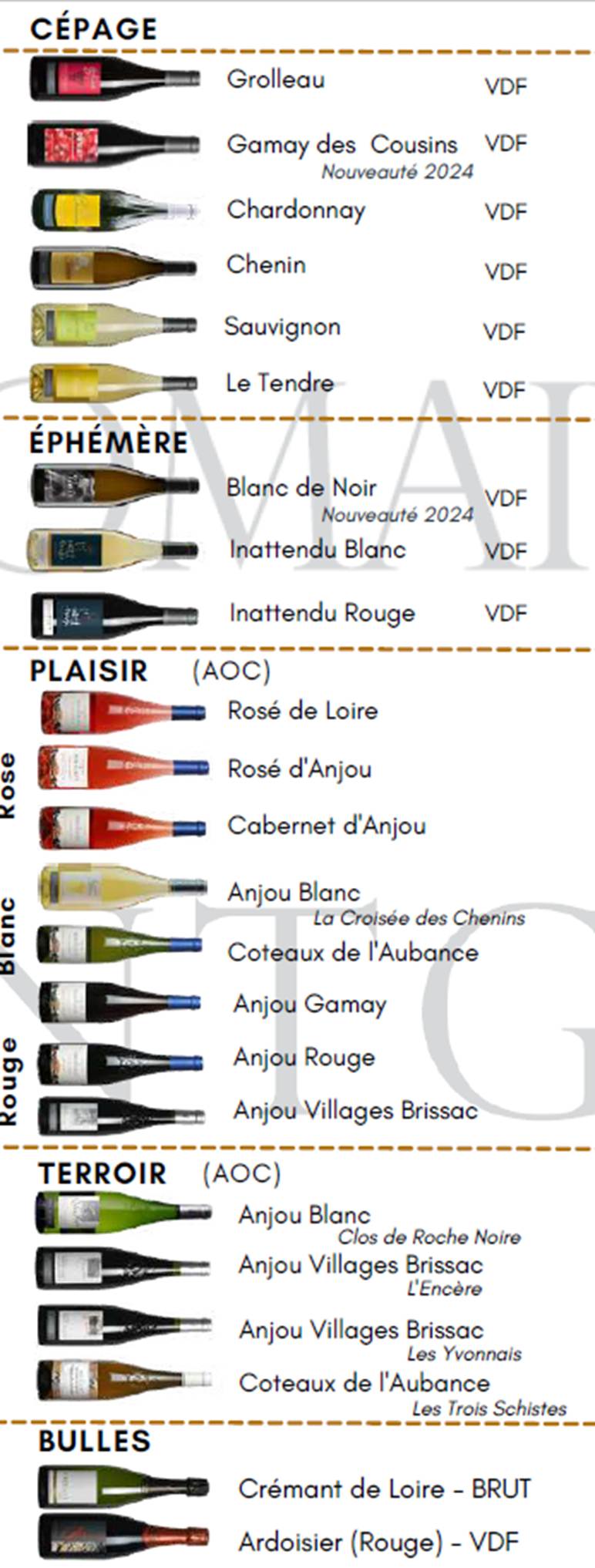 Les cépages sont typiques de la viticulture Ligérienne avec : le Chenin, qui permet de produire les Coteaux de l’Aubance, mais également les Anjou Blanc et la cuvée Moulin à Chenin (sec), Le cabernet Franc et Sauvignon employés dans l’élaboration des Anjou-villages Brissac et des Cabernet d’Anjou.